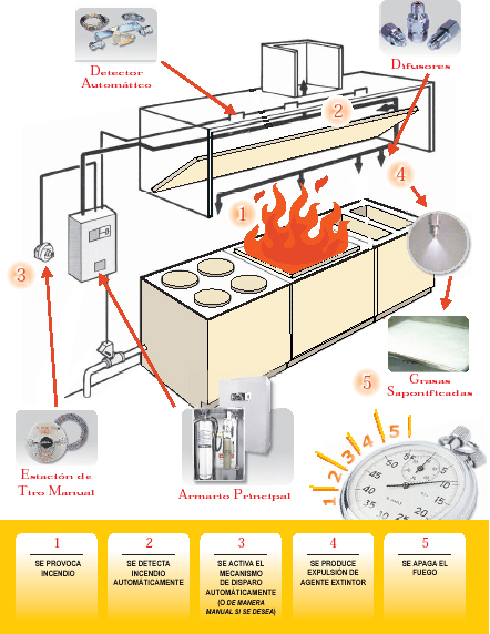 - Es un sistema específico para cocinas que funciona de modo natural por procedimiento químico de saponificación de las grasas sofocando el incendio por ahogamiento.